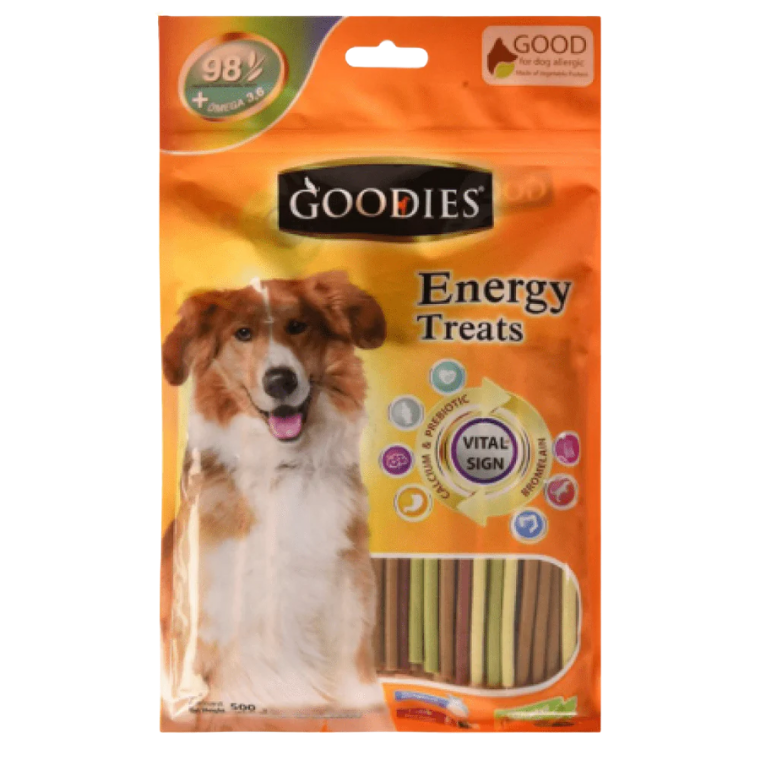Goodies Energy Treat is made from vegetable protein which is perfect for dogs. It is suitable for all breeds and ages of dog with high quality ingredients, its texture can be flexible and fun to chew by you dog. Goodies Energy Teat is not only facilitates the oral cleaning process naturally but also added supplements such as Chlorophyll, Calcium, Bromelain Enzyme and Fructo-Oligosaccharide to ensure your dogs have good healthy life.