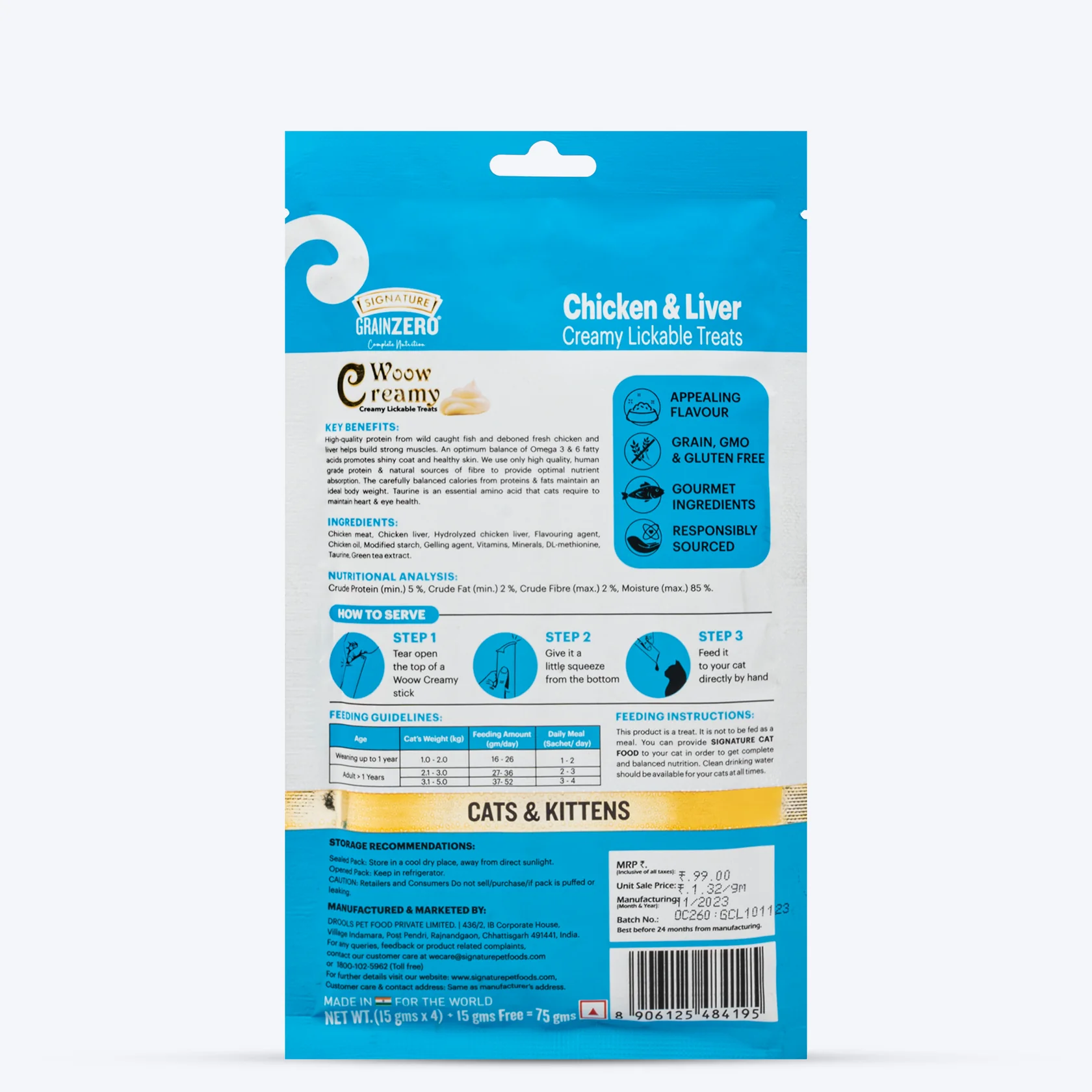 Name & Address of Manufacturer: Drools Pet Food Private Limited, 436/2, IB Corporate House, Village Indamara, Post Pendri, Rajnandgaon, Chhattisgarh 491441, India. ; Contact Number – 1800 270 3585